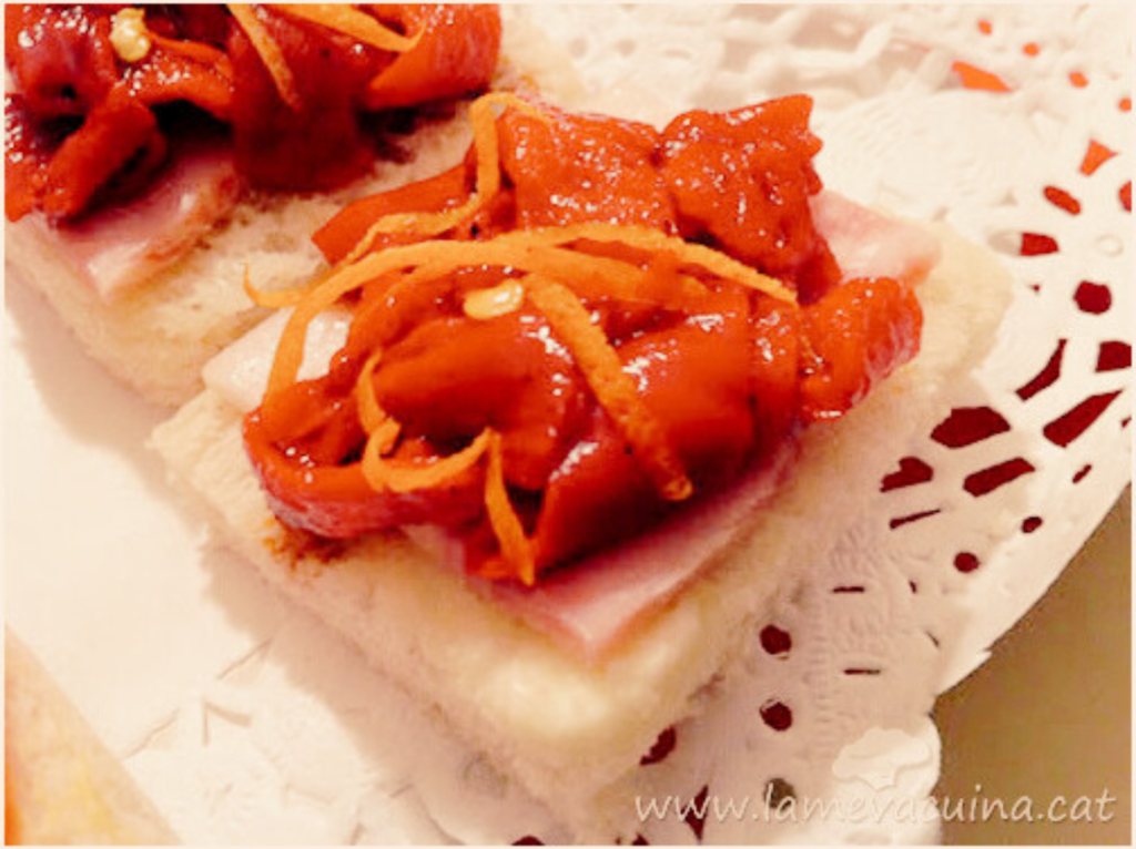 PAS 2: Damunt hi posem un bocinet de bacó fumat i pel damunt hi afegim el pebrotet del piquillo talladet a tiretes.