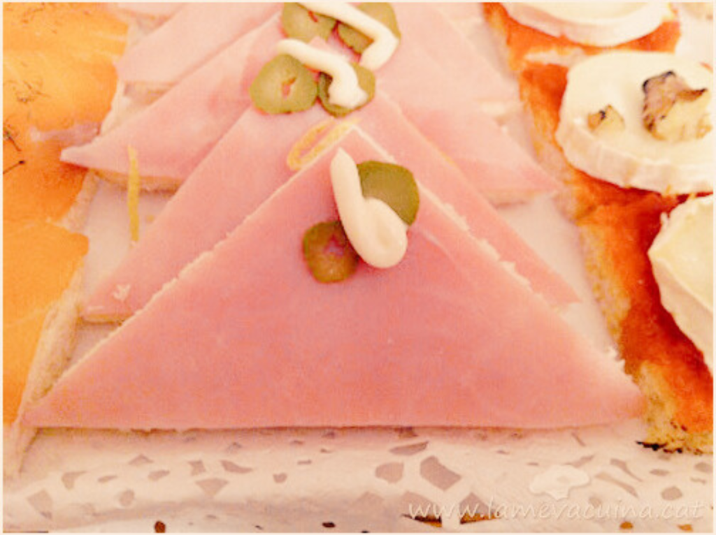 PAS 2: Untem els triangles amb mantega una mica desfeta, només una mica, al microones o margarina i presentem el tall de pernil dolç. Retallem el pernil que sobra.