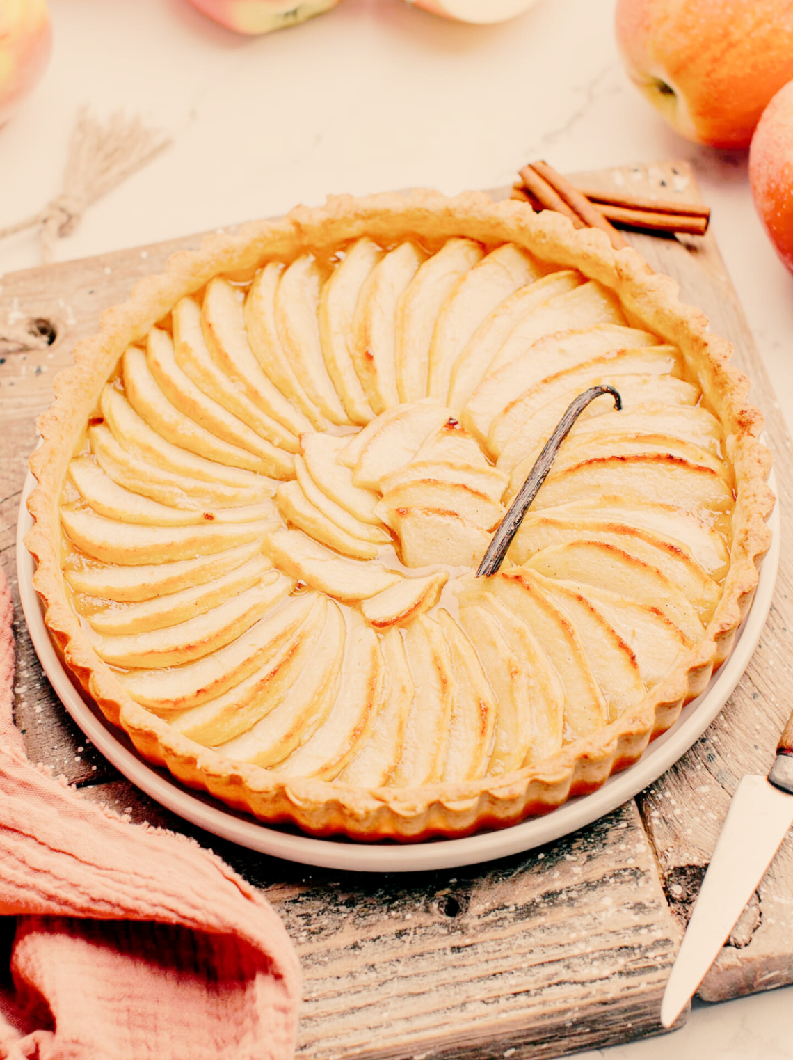 La tarta de poma es fa quan les vores de l’escorça són daurades i les pomes caramelitzen a les vores. El fons de massa també ha de ser daurat i hauríeu de poder aixecar tota la tarta de la safata amb facilitat.